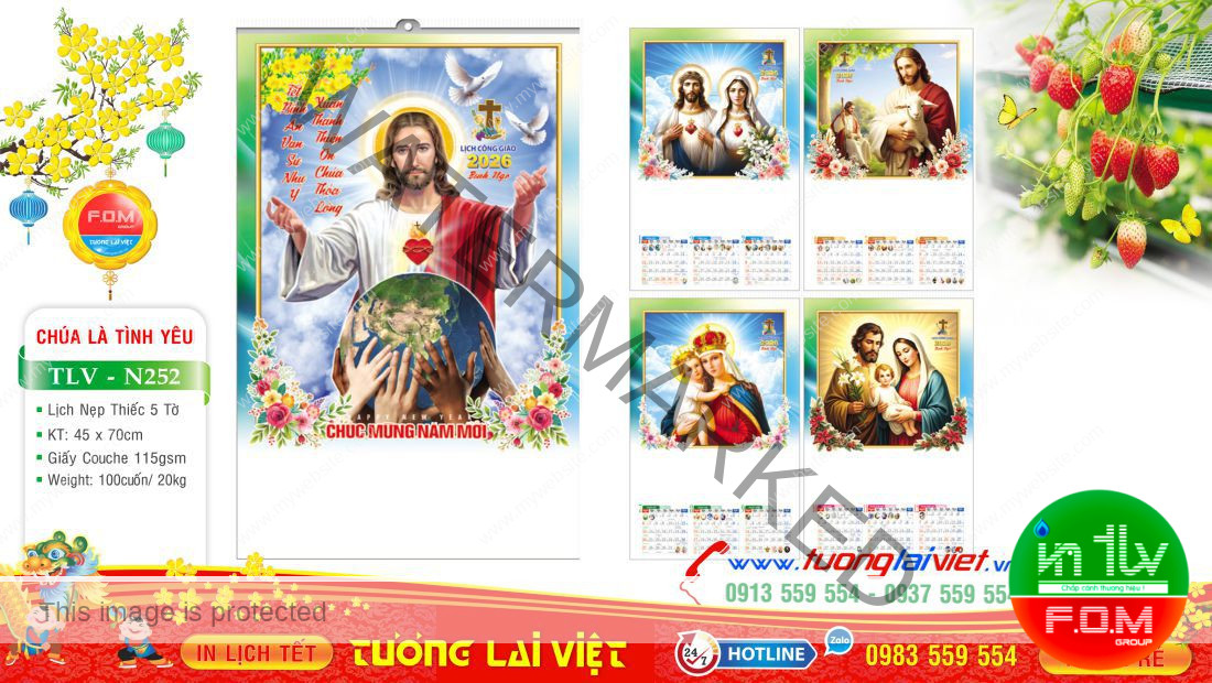 Lịch 5 tờ nẹp thiếc thường được in Offset 1 mặt trên giấy C105gsm, có kích thước: 36×70 và 45x70cm. Lịch 5 tờ Chúa giesu là mẫu lịch tờ treo tường giá rẻ nên được nhiều cửa hàng nhỏ lẻ chọn in lịch tết năm nay để làm quà tặng cuối năm cho khách hàng, bạn bè, đối tác và người thân nhân dịp năm mới.